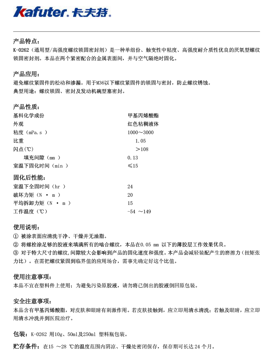 K-0262高強(qiáng)度螺紋鎖固密封劑